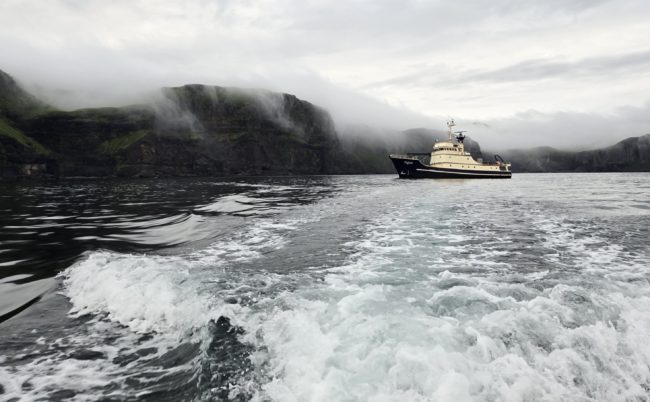 Caption for Title Photo: R/V Tiglax in Ugamak Bay off Aiktak Island. PC Deb Kurtz/Friends
