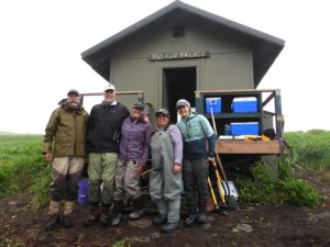Mark, Dan and Deb with Fish and Wildlife staff Mychele Smith and Stacey Buckelew, invasive species biologist in front of the Puffin Palace where two biotechs spend the summer alone on uninhabited Aiktak Island monitoring seabirds. Note the team has dug the Poa grass out from around the Puffiin Palace, and it is now ready for laying geotextile fabric to prevent new growth. Aiktak is one of the annual monitoring seabird sites for the Alaska Maritime National Wildlife Refuge. The decades of data gathered here are not only important for documenting trends in seabird populations but is also used by other researchers to shed light on the state of life in the ocean and environmental disruptions. PC/USFWS